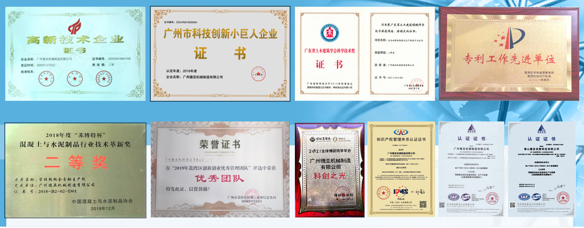 近年來(lái),德亞創(chuàng)新發(fā)展成果顯著,先后獲得了中國(guó)混凝土與水泥制品行業(yè)“蘇博特杯”技術(shù)革新獎(jiǎng)、中國(guó)建材機(jī)械工業(yè)協(xié)會(huì)技術(shù)革新獎(jiǎng)、廣東省土木建筑學(xué)會(huì)科學(xué)技術(shù)獎(jiǎng)、廣東省知識(shí)產(chǎn)權(quán)示范企業(yè)、廣州首臺(tái)(套)重點(diǎn)技術(shù)裝備推廣獎(jiǎng)、廣州科技創(chuàng)新項(xiàng)目獎(jiǎng)、發(fā)明專利產(chǎn)業(yè)化創(chuàng)新獎(jiǎng)等殊榮。