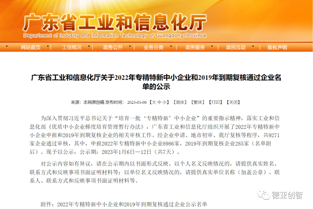 喜訊!德亞入選2022年度廣東省“專精特新”企業(yè)
